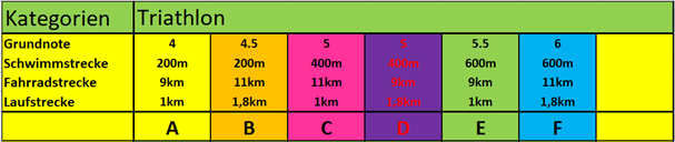 Die verschiedenen Kategorien und die entsprechende Note, beim Einhalten der Zeit von 50 – 60 Minuten. (5 Minuten schneller, bedeutet ½ Note Zuschlag; bist du langsamer